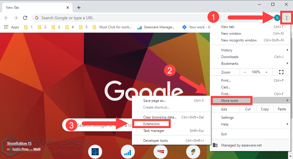 1) В правом верхнем углу окна нажмите на три точки значок и выберите Дополнительные инструменты> Расширения .
