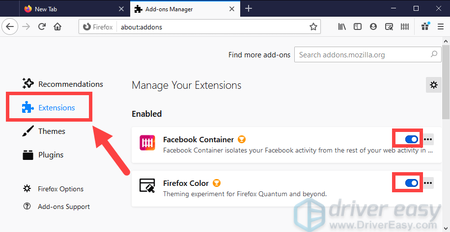 2) На левой панели щелкните Расширения . Под Управляйте своими расширениями раздел, щелкните синий тумблер чтобы он стал серым.
