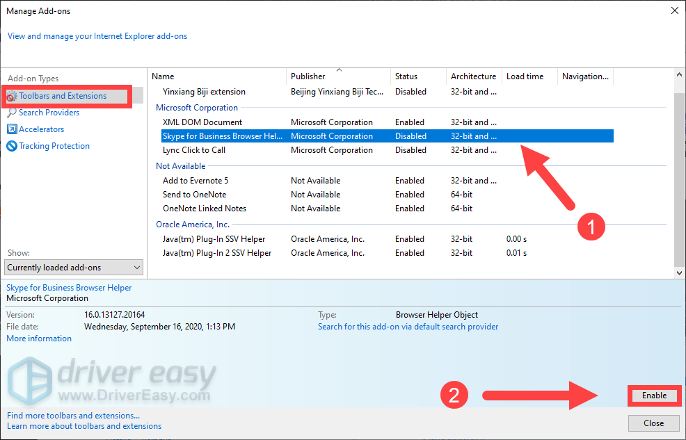 2) Под Панели инструментов и расширения раздел, щелкните надстройку, которую хотите отключить, и щелкните Отключить .