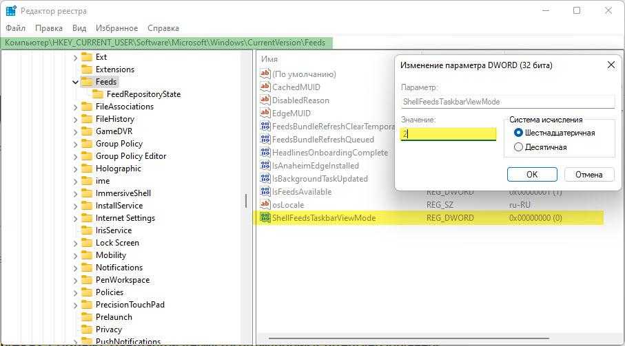 - Здесь вы должны отредактировать запись реестра с именем «ShellFeedsTaskbarViewMode». Для этого дважды щелкните на параметр и установите нужную конфигурацию.