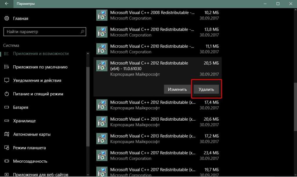 Кнопка «Удалить» в «Приложения и возможности» деинсталирует выбранную программу