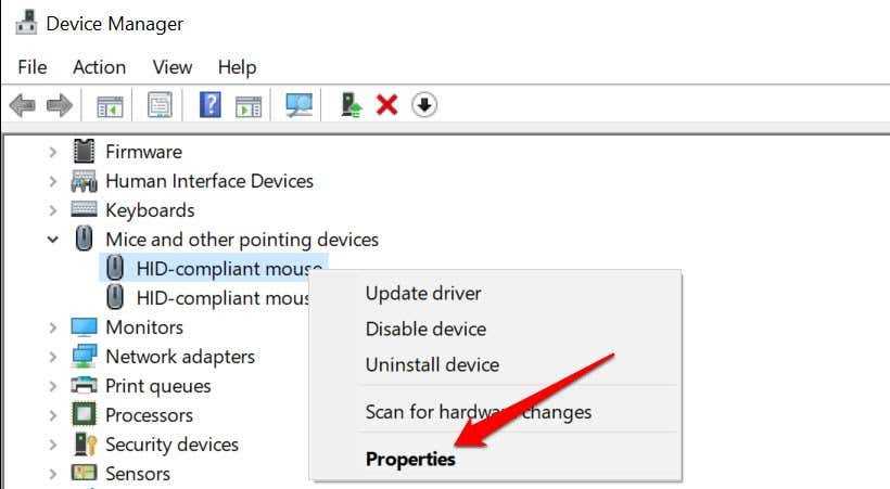 - Разверните категорию «Мыши и другие указывающие устройства», щелкните правой кнопкой мыши или нажмите и удерживайте драйвер мыши и выберите «Свойства».
