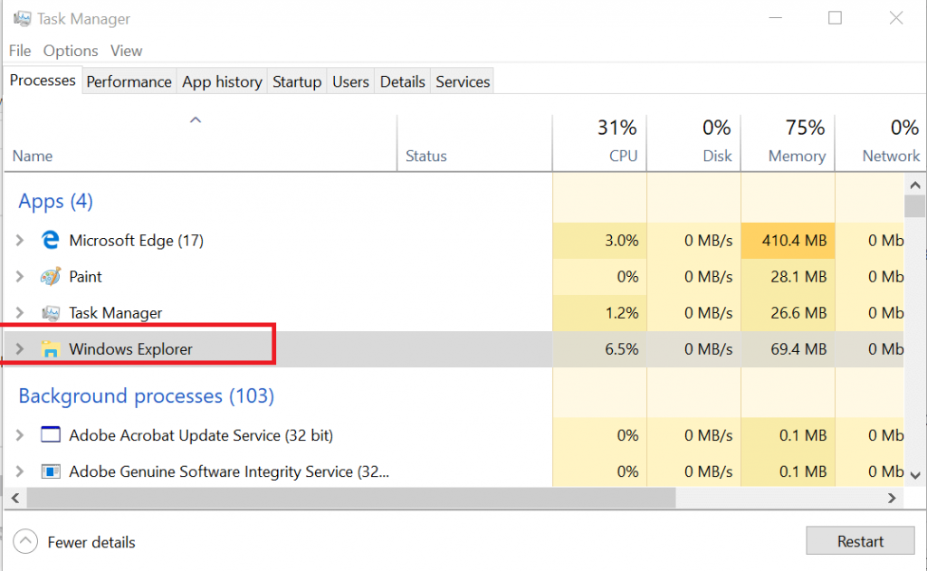 - Найдите проводник Windows на вкладке процесса. Выберите его и нажмите « Перезагрузить».