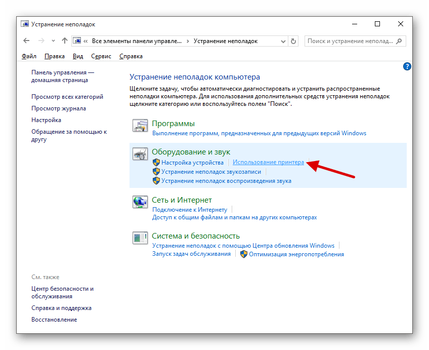 В разделе «Оборудование и звук» выберите «Использование принтера».