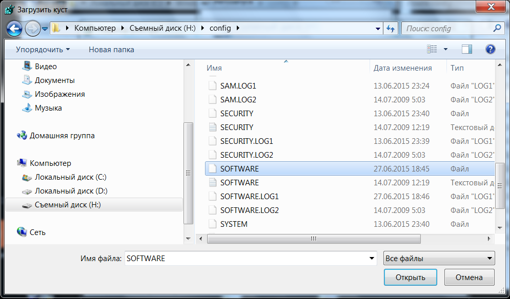 Для загрузки других веток реестра, необходимо выбирать соответствующие файлы на жестком диске. Таблица соответсвия веток реестра и файлов на жестком диске приведена в главе данного руководства.