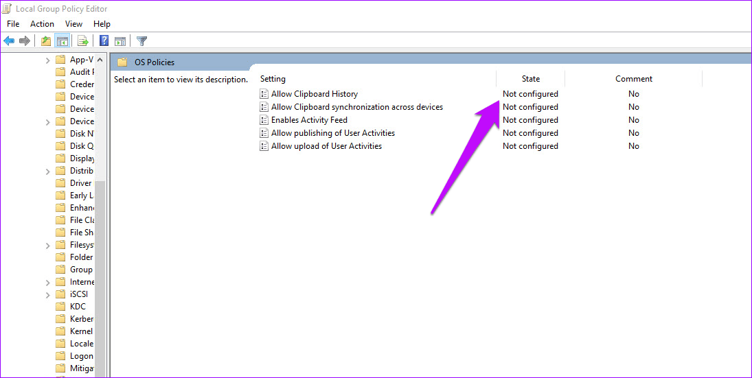 Шаг 3: Теперь перейдите к Административным шаблонам> Система> Политики ОС. В разделе «Политики ОС» вы увидите параметры для истории буфера обмена и синхронизации. И есть вероятность, что состояние будет установлено как Не настроено для обоих.