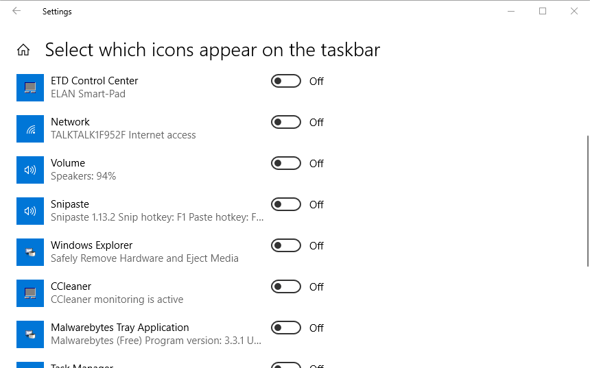 Если вы не можете найти значок на панели задач OneNote, щелкните правой кнопкой мыши панель задач Win 10 и выберите параметр «Параметры панели задач» . Выберите, какие значки появляются на панели задач, чтобы открыть список значков, как показано ниже. Включите значок «Отправить в OneNote», чтобы включить его в системный трей.