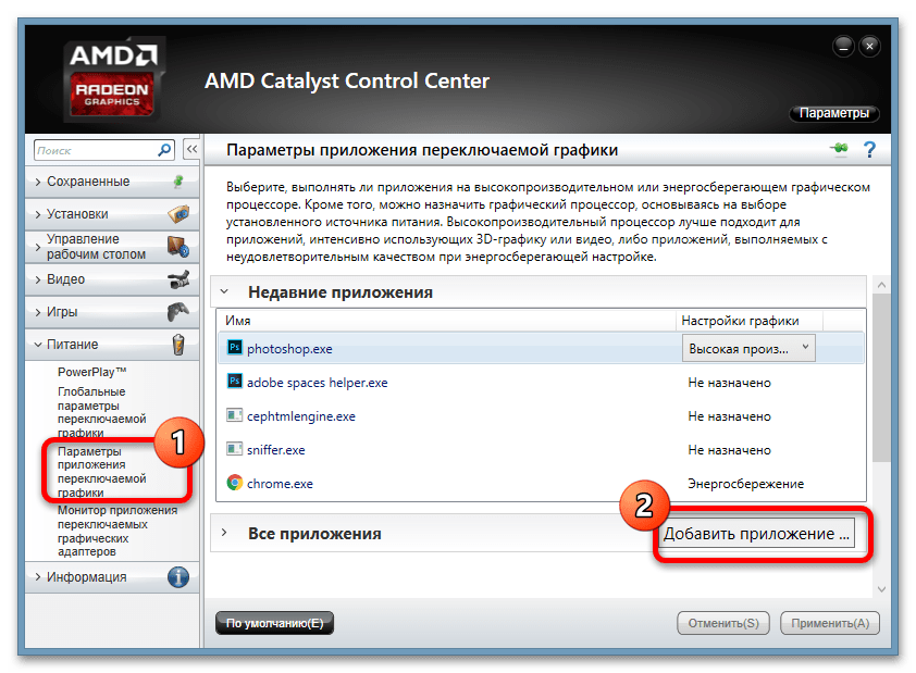 Здесь откройте пункты «Питание» – «Параметры приложения переключаемой графики». Последний вариант может также называться «Переключаемые графические адаптеры».
