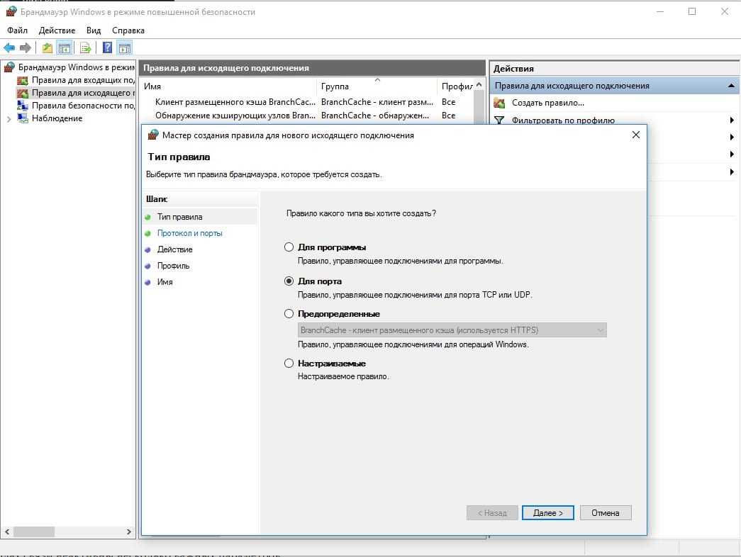 - В разделе «Правила для исходящего подключения» выбираем вариант «Для порта».