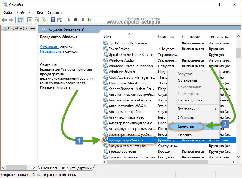 2Откроется окно служб. Среди них найдите «Брандмауэр…» Нажмите на нем правой кнопкой мыши и в выпадающем меню кликните «Свойства».