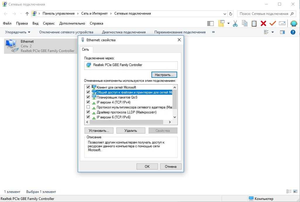 - Включаем «Общий доступ к файлам и принтерам», а также – «IP версии 6».