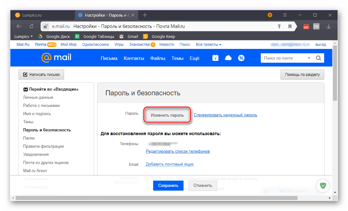 На открывшейся странице обратите внимание на вкладку «Пароль и безопасность», что расположена в левой части экрана. Здесь нужно воспользоваться кнопкой «Изменить пароль». Также вы можете сгенерировать надёжный пароль, воспользовавшись соответствующей ссылкой. В этом случае он автоматически применится к вашему почтовому ящику.
