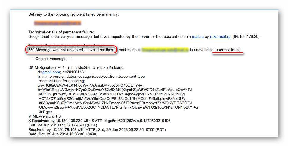 В самой ошибке с текстом «550 Mailbox unavailable» или «Message was not accepted» нет ничего страшного. Однако решить её самостоятельно можно только в тех ситуациях, когда вы неправильно написали электронный адрес получателя или если ваш ящик был временно заблокирован за подозрения в рассылке спама (актуально только для Mail.ru).