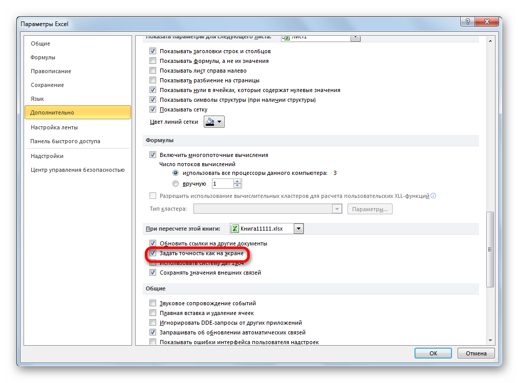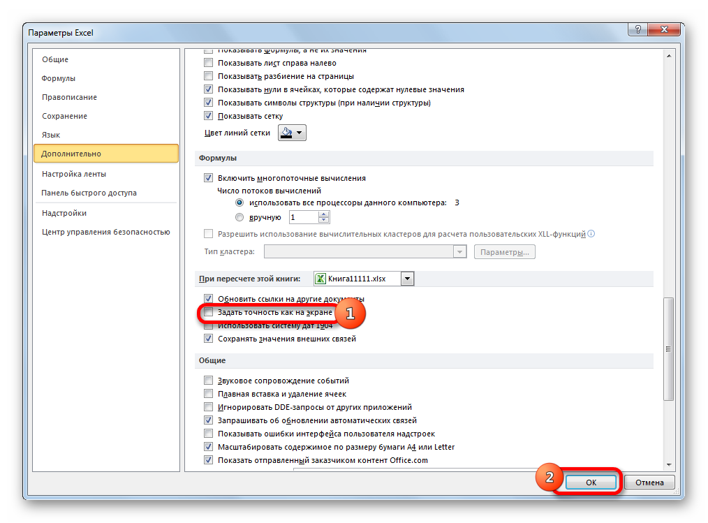 После этого в программе Excel 2010 и выше будет включен режим «точность как на экране».