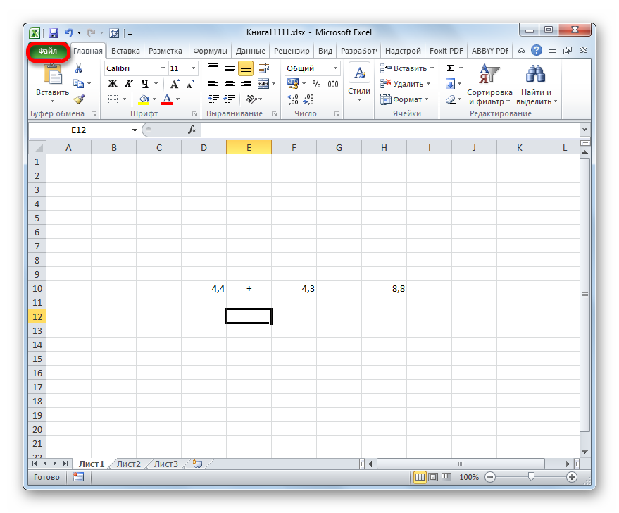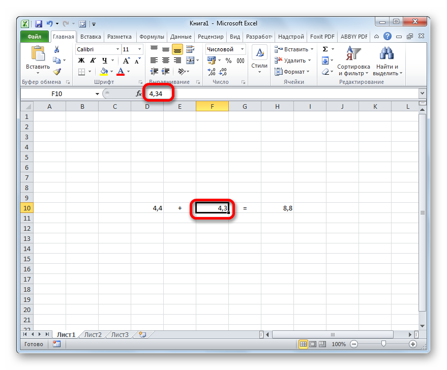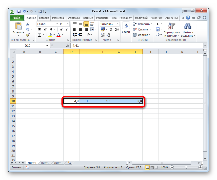 Это как раз связано с тем, что реально для расчета Эксель продолжает брать числа 4,41 и 4,34. После проведения вычисления получается результат 4,75. Но, так как мы задали в форматировании отображение чисел только с одним десятичным знаком, то производится округление и в ячейку выводится число 4,8. Поэтому создается видимость того, что программа допустила ошибку (хотя это и не так). Но на распечатанном листе такое выражение 4,4+4,3=8,8 будет ошибкой. Поэтому в данном случае вполне рациональным выходом будет включить настройку точности как на экране. Тогда Эксель будет производить расчет не учитывая те числа, которые программа держит в памяти, а согласно отображаемым в ячейке значениям.