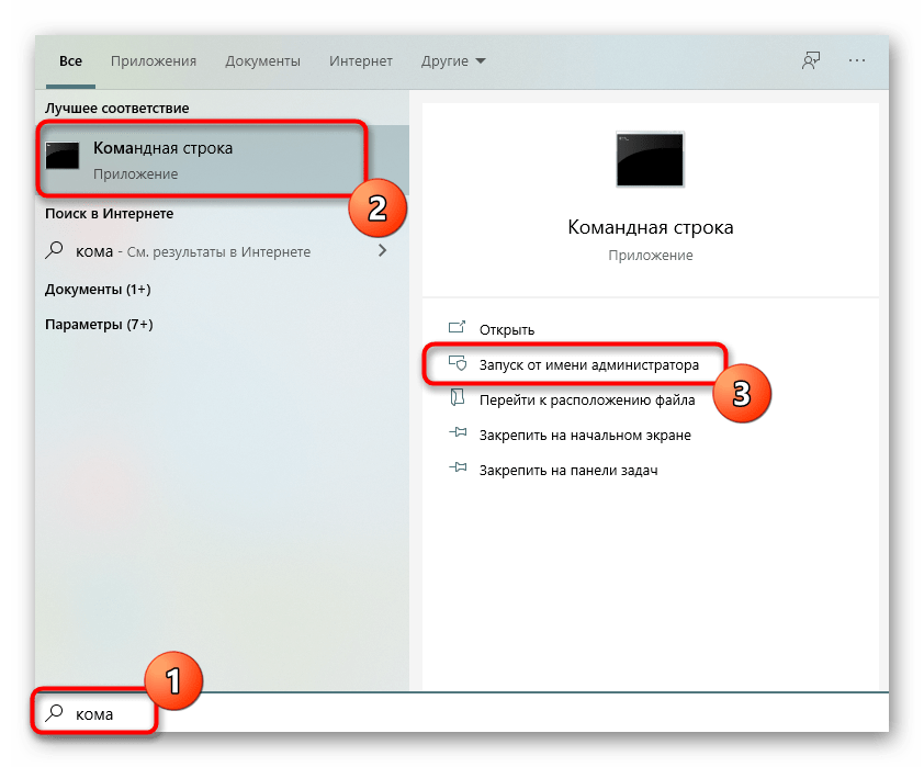 Запустите «Командную строку» от имени администратора. Проще всего сделать это, воспользовавшись поиском в «Пуск».