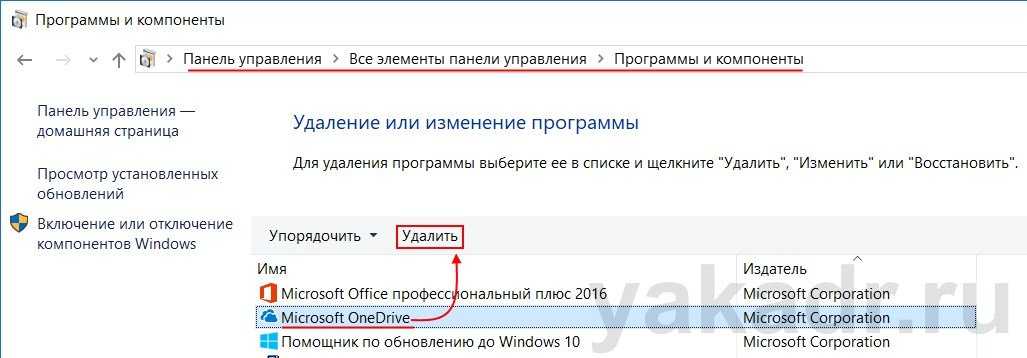- Выберите из списка Microsoft OneDrive нажмите в верхней панели кнопку Удалить и подтвердите удаление программы.