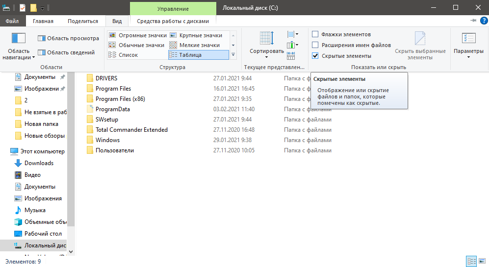 Наиболее частой причиной, почему забивается диск С в Windows 10, являются временные файлы. Они остаются в операционной системе после посещения интернета или обновления ОС. При выключении компьютера система их не удаляет, а сохраняются на локальном диске в папке «Temp». Их можно убрать вручную из «Проводника». Зайдите в Диск С, в меню Вид поставьте галочку на отображение скрытых элементов.
