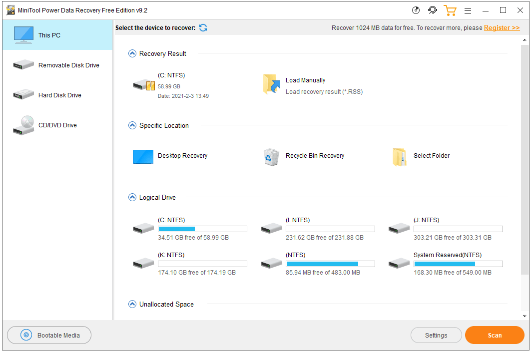 Шаг 1. Запустите MiniTool Power Data Recovery. Выберите категорию устройства в левом столбце. Здесь мы выбираем This PC. Затем выберите целевой диск, содержащий ваши удаленные или потерянные файлы. Нажмите кнопку «Сканировать».
