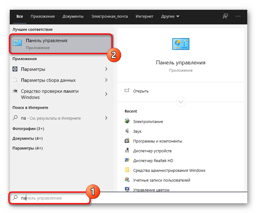 - Откройте «Пуск» и через поиск перейдите в приложение «Панель управления».