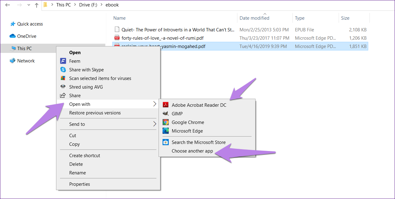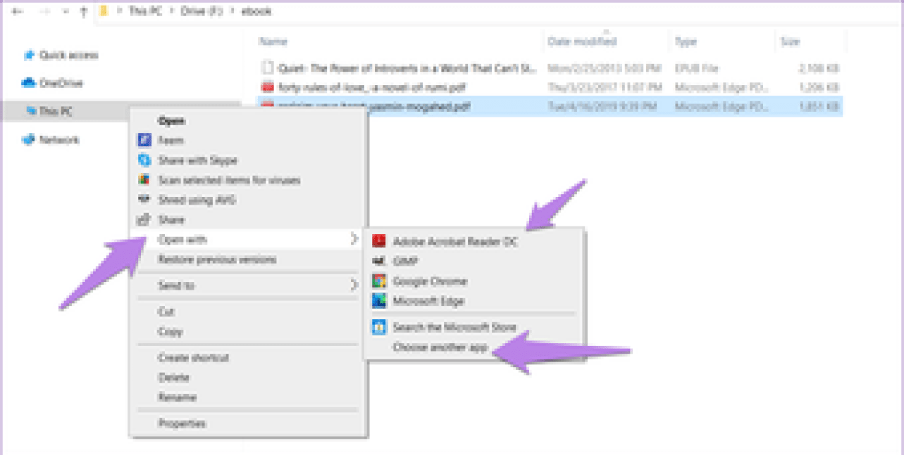 Шаг 2: Щелкните файл правой кнопкой мыши и выберите Открыть с помощью. Если Adobe Reader присутствует в списке, щелкните по нему. В противном случае нажмите Выбрать другое приложение и выберите Adobe Reader.