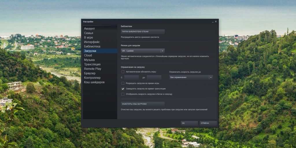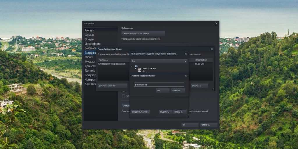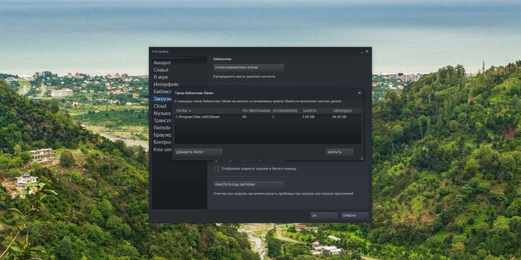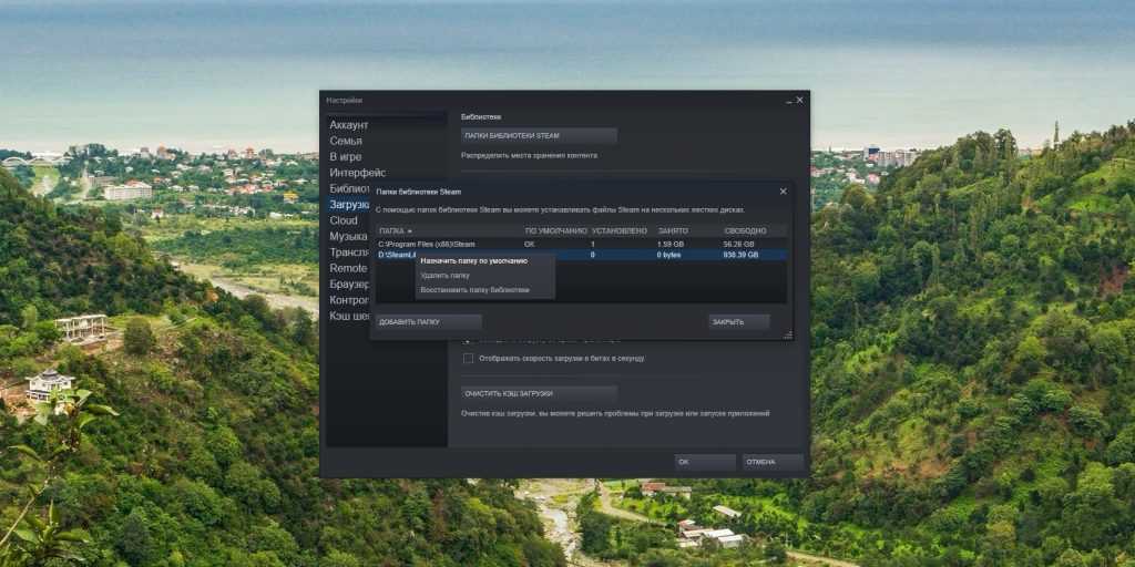 Игры занимают много места, и иногда это единственная причина покупки дополнительного ёмкого SSD. Чтобы изменить место установки проектов из Steam, сделайте следующее: нажмите «Steam» → «Настройки» → «Загрузки». Щёлкните кнопку «Папки библиотеки Steam».