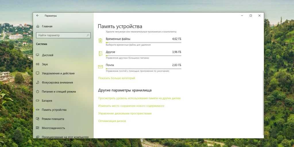 Программы из Microsoft Store можно запросто заставить устанавливаться не на системный, а на любой другой диск. Для этого откройте «Параметры» → «Система» → «Память устройства». Нажмите «Изменить место сохранения нового содержимого».