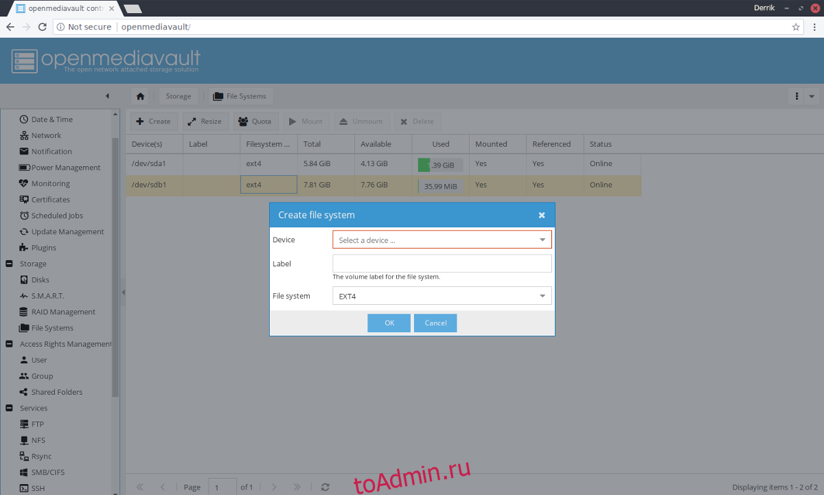 Для настройки общего ресурса NFS в OpenMediaVault сначала требуется пригодная для использования файловая система. К сожалению, OMV не позволяет пользователю создавать общий ресурс из веб-интерфейса на жестком диске ОС. Именно из-за этого мы рекомендуем использовать для данных выделенный жесткий диск. Если вы не можете позволить себе использовать несколько жестких дисков, рассмотрите возможность переустановки OpenMediaVault и выполнения пользовательской настройки раздела, а не автоматической настройки. Другой вариант — виртуализация OpenMediaVault. Использование ОС в качестве виртуальной машины позволяет пользователям создавать собственные виртуальные жесткие диски.