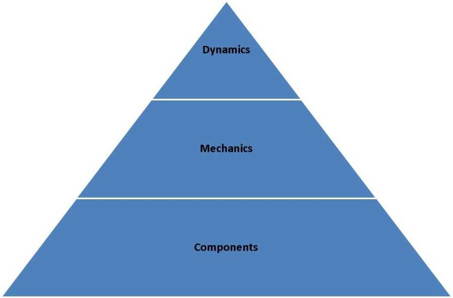Как видно на рисунке, на нижнем уровне Пирамиды расположены компоненты игры, на среднем – механика игры и на высшем – динамика игры. Помимо этого, существуют также ощущения от игры и переживания участников, но, несмотря на то, что они являются в игре ключевыми факторами, дать им описание и внести их в пирамиду очень сложно. Поэтому и были включены только вышеназванные составляющие.