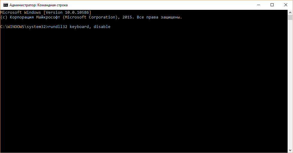 Чтобы заблокировать клавиатуру на ноутбуке с помощью внутренних средств Windows, необходимо от имени администратора запустить адресную строку. Запустить ее можно с помощью клавиш Win+R. В открывшемся окне следует прописать «rundll32 keyboard, disable» и нажать клавишу Enter.