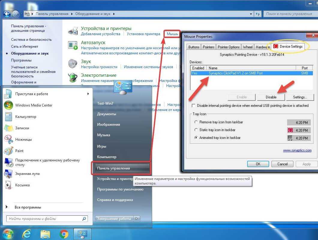 В Windows 7 и Vista доступ к этим настройкам находится по следующему пути: Пуск > Панель управления > Оборудование и звук > Мышь. Да, в этих операционных системах тачпад вынесен в настройку мыши, и если драйвер сенсорной панели установлен, то появится отдельная вкладка с настройками, где можно отключить работу устройства.