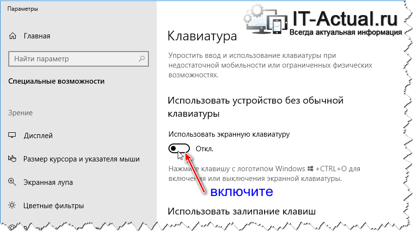 И далее в открывшемся окне переключением опции, которая позволяет использовать экранную клавиатуру.