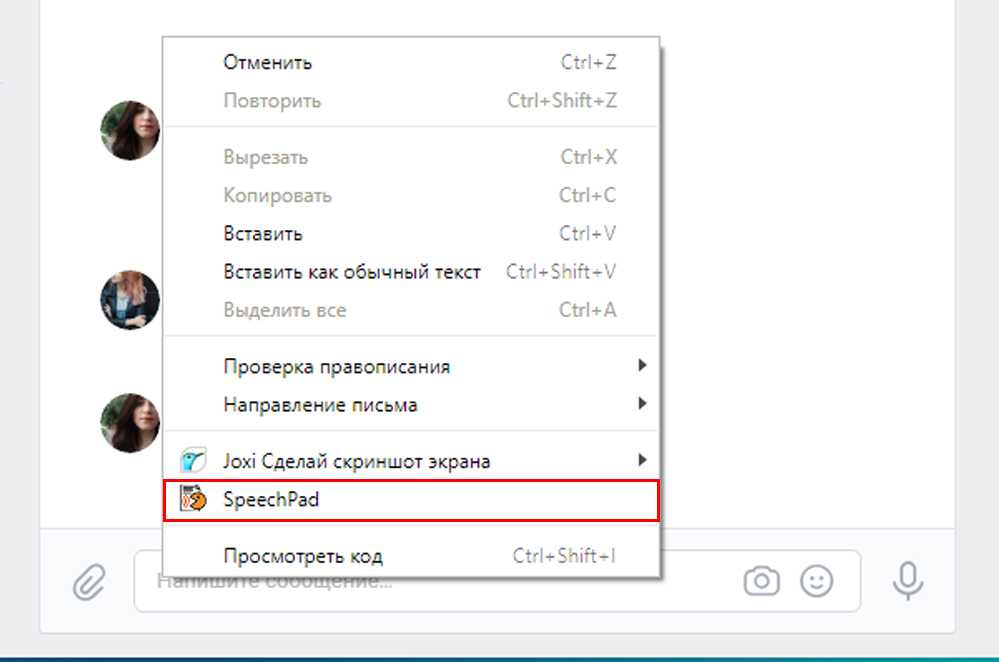 Попробуем надиктовать сообщение в ВКонтакте. Открываем диалог, кликаем правой кнопкой мыши и выбираем расширение.