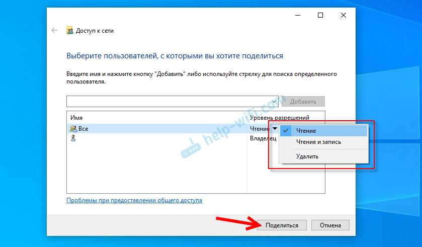 Таким образом мы открыли всем пользователям сети общий доступ к нужной папке. Но Windows по умолчанию назначает общий доступ только в части просмотра данных. Чтобы сетевые пользователи могли в эту нашу папку помещать свои файлы, необходимо для категории «Все» дополнительно установить право записи данных. Кликаем выпадающий список уровня разрешений и выбираем пункт «Чтение и запись». По итогу жмём внизу кнопку «Общий доступ».