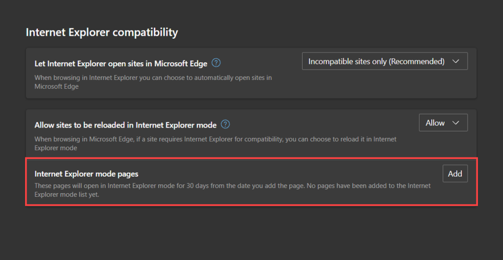 3. Нажмите кнопку «Добавить» рядом со страницами режима Internet Explorer.