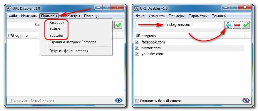 У URL Disabler есть примеры сайтов для добавления в список блокировки. Кликаем их, и они добавляются в этот список. А чтобы добавить свой какой-то сайт в список блокировки, в поле ввода утилиты вписываем его домен. Затем жмём голубую кнопку-плюсик.