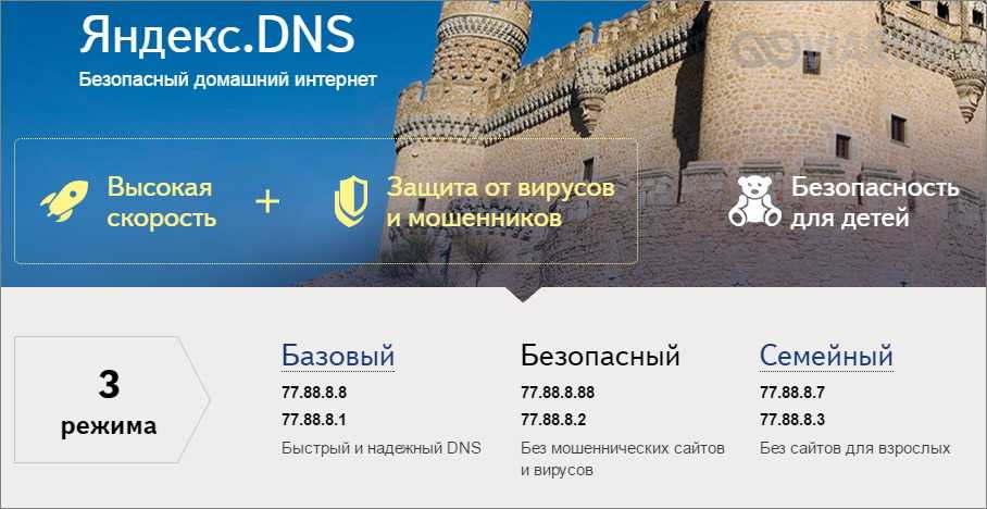 В рамках ограничения доступа к сайтам для ребенка можно использовать бесплатный сервис Яндекс.DNS, предназначенный для фильтрации нежелательного контента, фишинговых и потенциально опасных сайтов. Для этого вам необходимо зайти на сайт dns.yandex.ru и выбрать один из трех режимов. Доступны Базовый, Безопасный и Семейный, каждый со своими предпочитаемыми и альтернативными DNS-серверами.