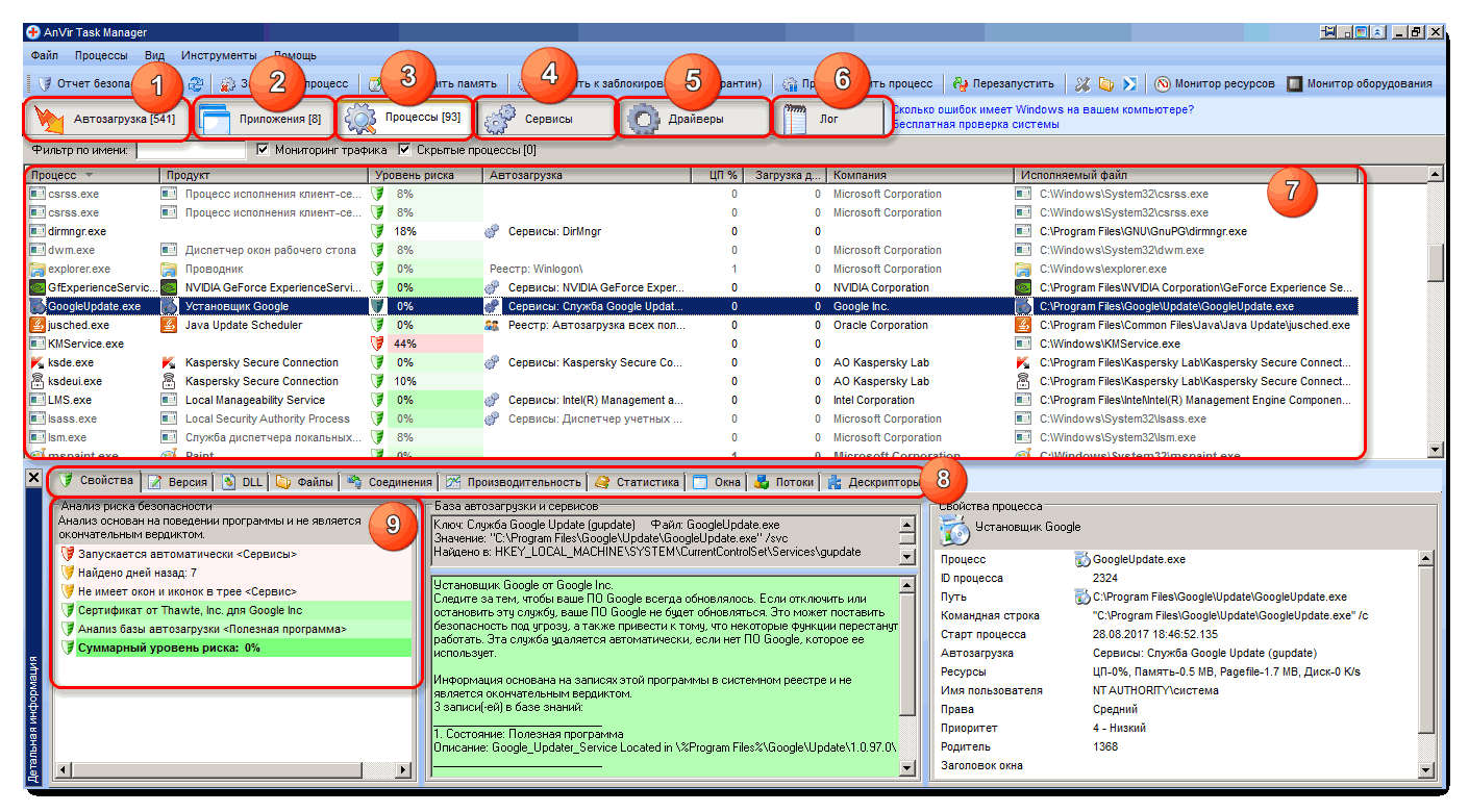 Далее, под цифрой 7 – основное окно с перечнем объектов, в данном случае – процессы (т.к. активна вкладка “Процессы”).