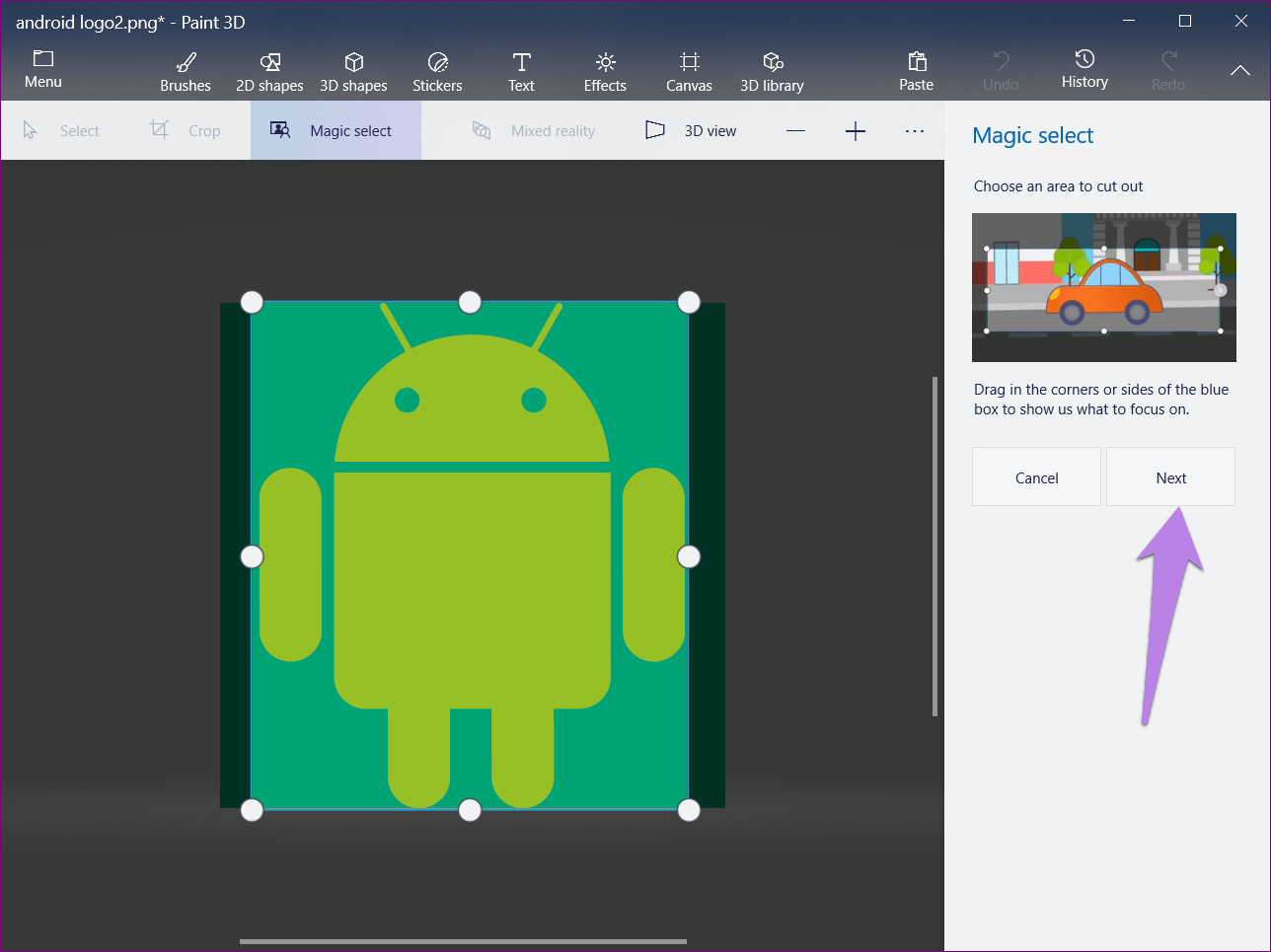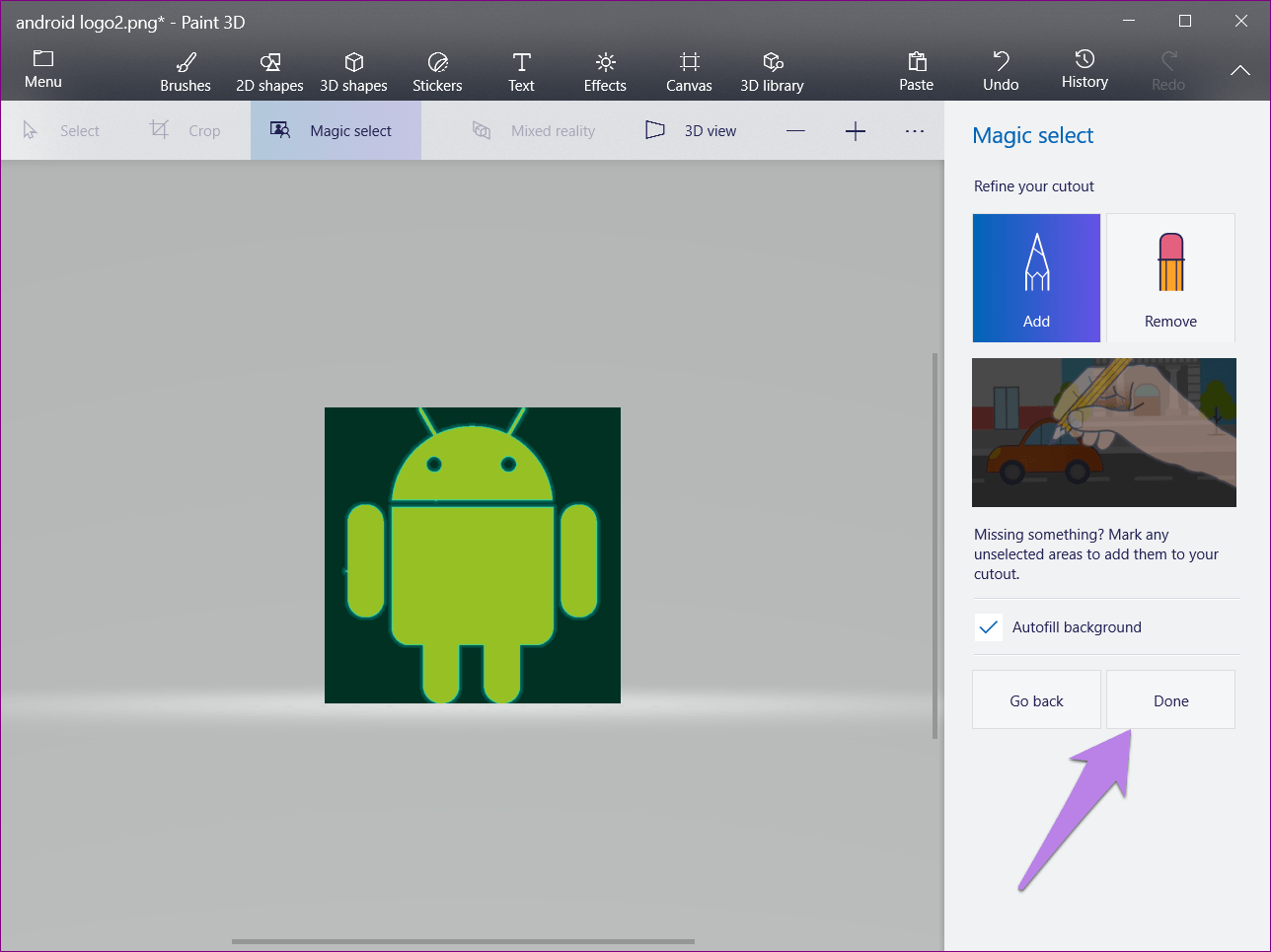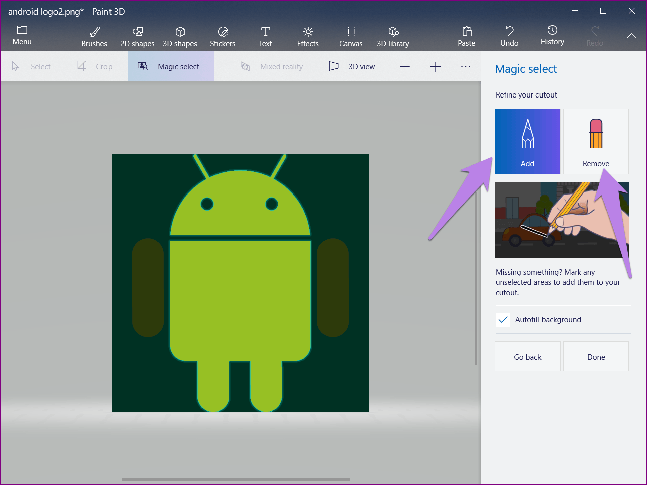 Шаг 6: Как правило, Paint 3D автоматически обнаруживает объект и выделяет его. Однако, если весь ваш объект не выделен или есть дополнительные области, используйте параметр «Добавить» или «Удалить», чтобы изменить выбор.