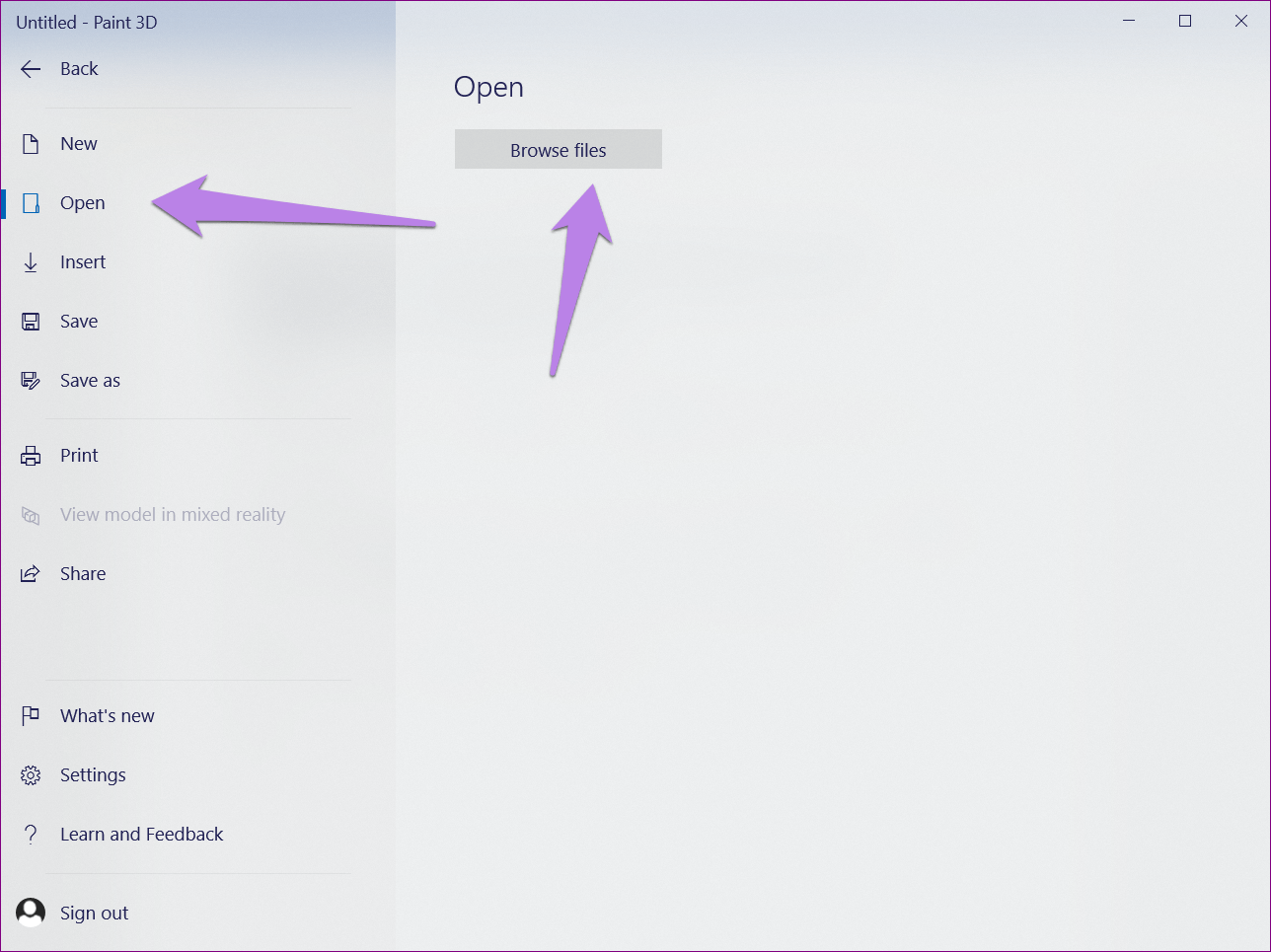 Шаг 2 : Выберите «Открыть» в меню и нажмите «Обзор файлов».