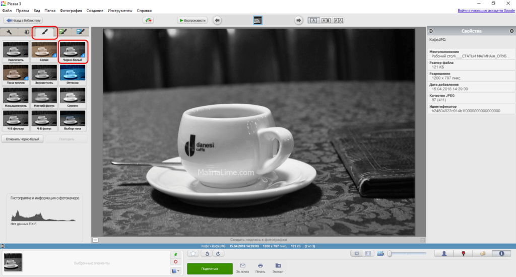 Сделать фото черно белым в Picasa