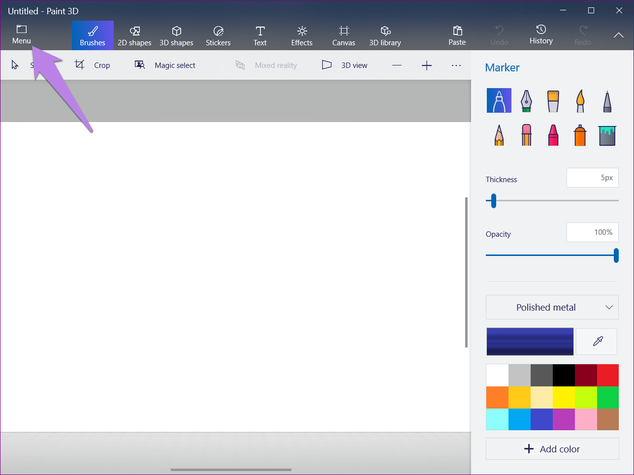 Шаг 1: Запустите Paint 3D на вашем ПК и нажмите на значок меню в верхней части.