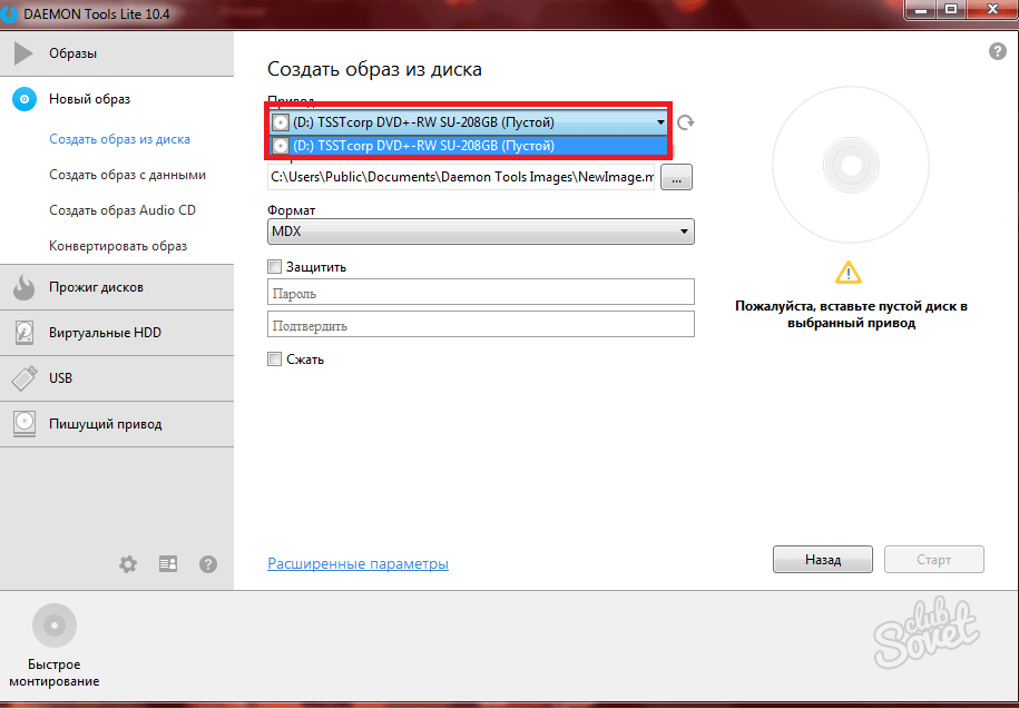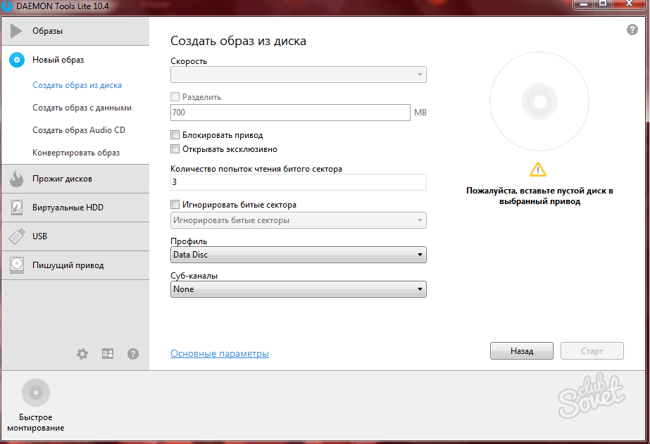 Настройка происходит достаточно быстро: вам нужно выбрать ваш оптический привод в поле “Привод”. В нем уже должен быть вставлен диск с данными.