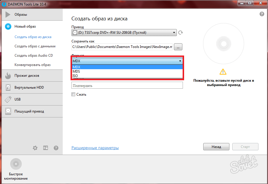 В поле “Формат” выберите желаемый формат будущего образа диска.