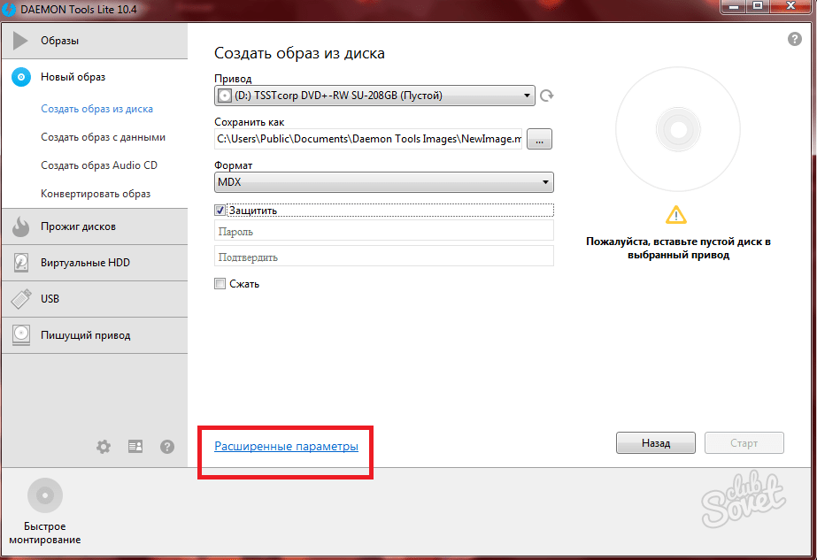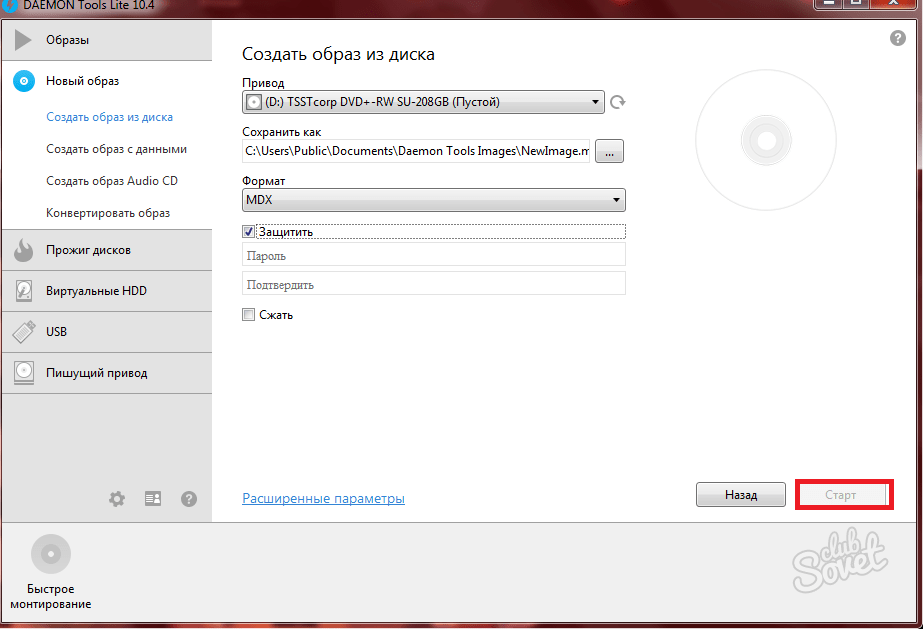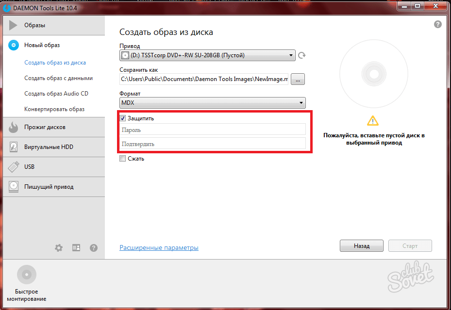 Вы можете защитить свой образ, чтобы открыть его можно было только с паролем. Для этого поставьте галочку возле слов “Защитить”, в затем дважды пропишите пароль. Не забудьте его и не сообщайте пароль никому.