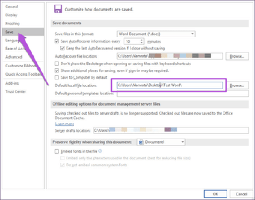 Чтобы изменить место сохранения по умолчанию в Word, перейдите в «Параметры» и выберите «Сохранить». Введите новый путь в поле «Местоположение локального файла по умолчанию» и нажмите OK.