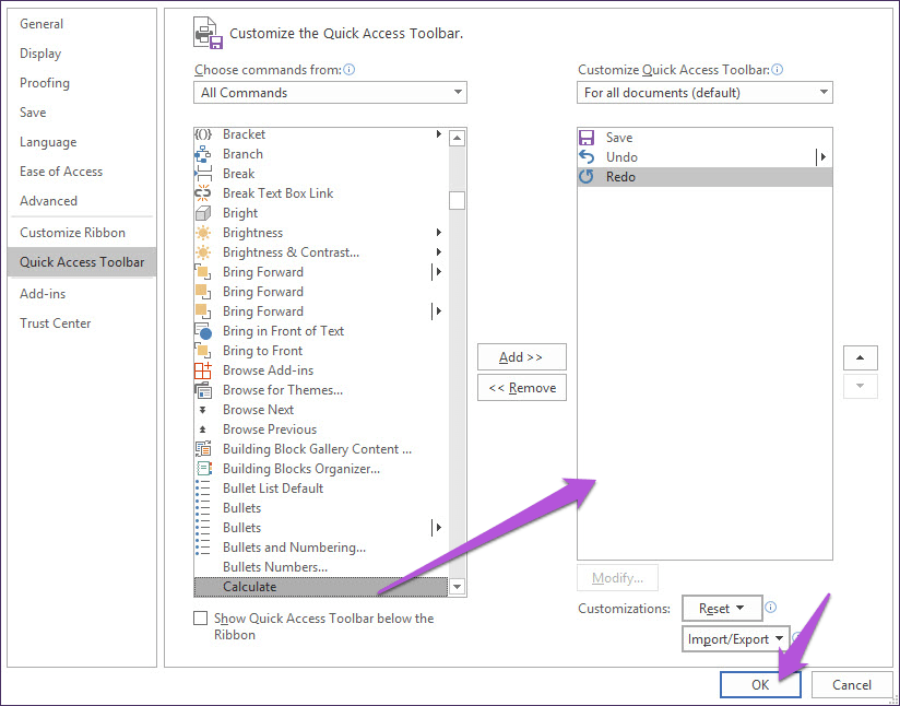 После включения все, что вам нужно сделать, это выбрать уравнения, и результаты будут отображаться в строке состояния. Чтобы включить его, нажмите «Файл»> «Параметры»> «Панель быстрого доступа» и выберите «Все команды» в раскрывающемся списке в разделе «Выбрать команды».