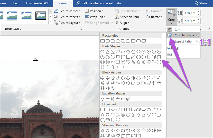 Все, что вам нужно сделать, это выбрать изображение и нажать «Обрезать». Выберите соотношение сторон 1: 1, хотя это не обязательный шаг. После этого выберите параметр «Обрезать по форме» и выберите форму из библиотеки. Перетащите ручку, как требует ваше изображение, и все.