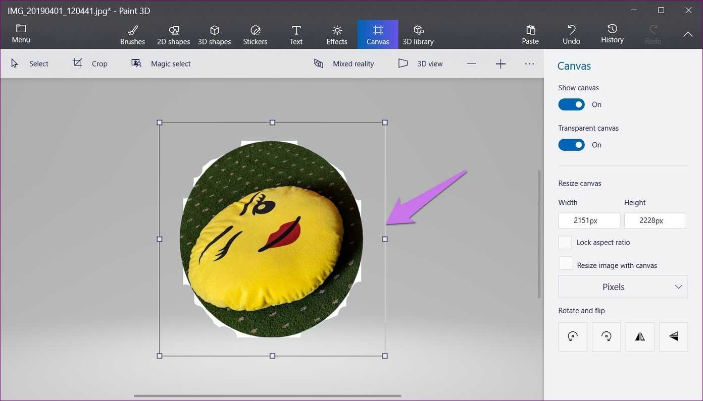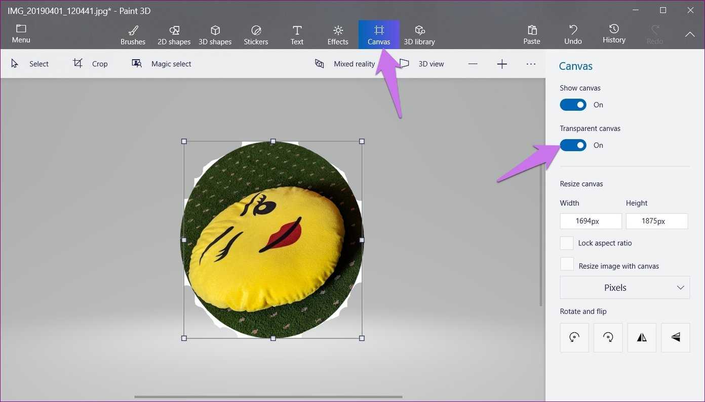 Шаг 2: Вы заметите, что размер обрезанного изображения немного увеличивается. Не беспокойся Выберите значок Canvas вверху и включите прозрачный холст. Большая часть белого фона исчезнет.