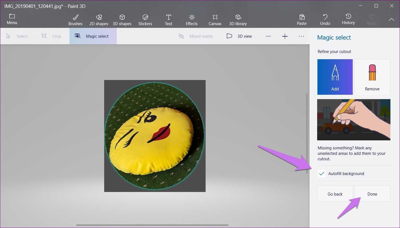Надеюсь, вы увидите, что Paint обнаружил точную форму круга. Если чего-то не хватает, уточните это с помощью кнопок Добавить или Удалить. Нажмите кнопку «Готово», убедившись, что выбран фон автозаполнения.